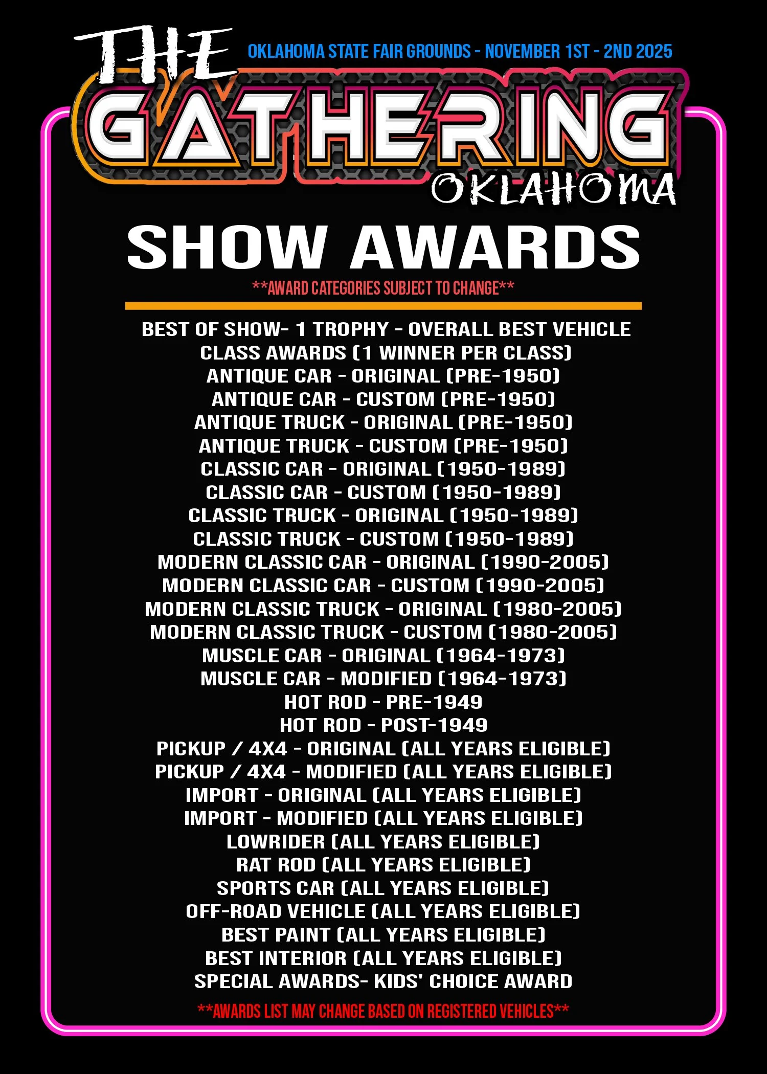 Awards are subject to change/removal based on the vehicles registered for the event
